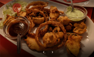Potatoes, cauliflower, aubergine, mushroom, mix of finely chopped onions, green chilies, and spices mixed in gram flour and deep-fried.